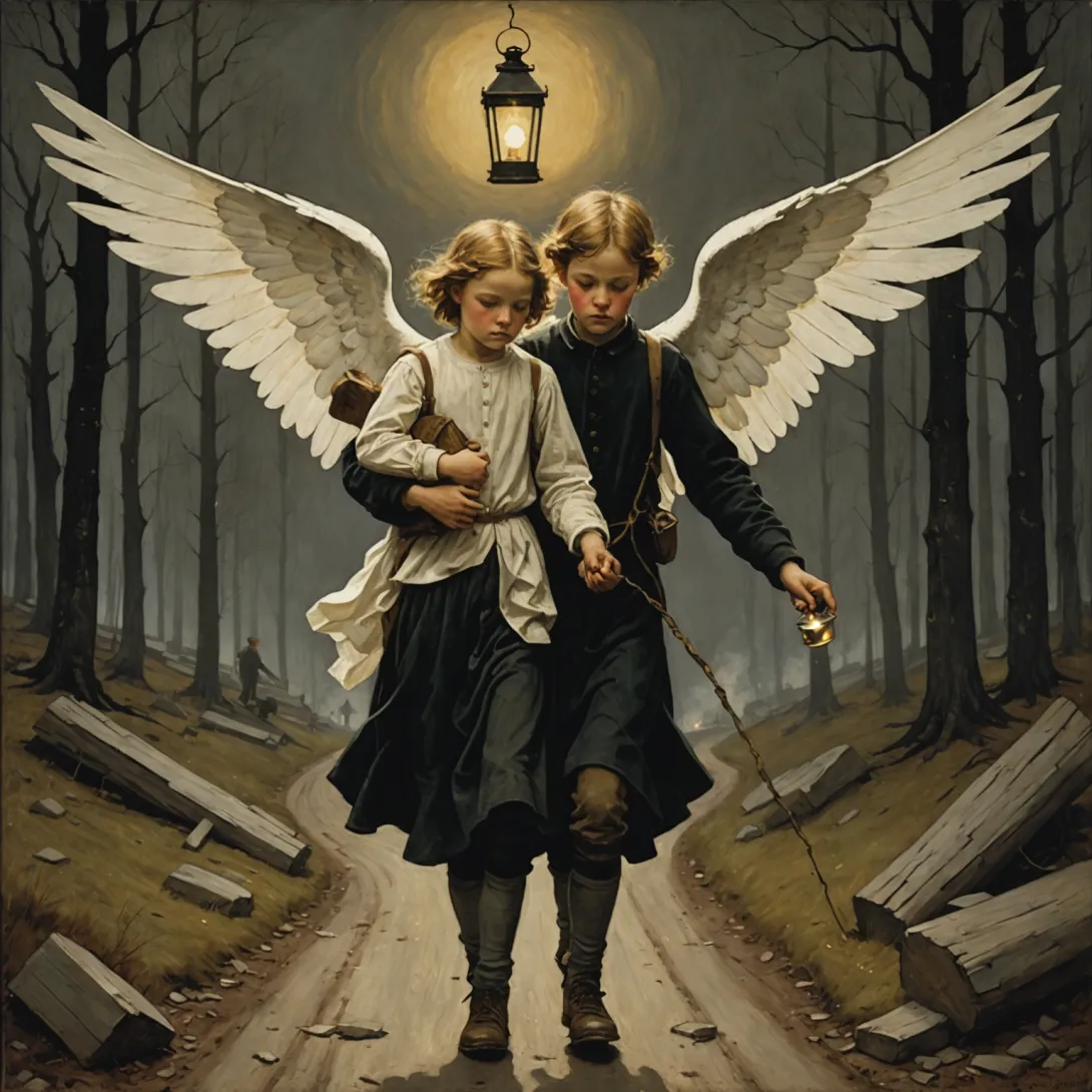 Картина «Раненый ангел» Хуго Симберга изображает двух детей, несущих на руках ангела с опущенными крыльями, который явно ранен. Один из детей держит фонарь, освещая путь, а выражения лиц персонажей передают смесь тревоги, сострадания и решимости.